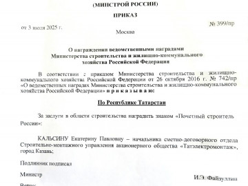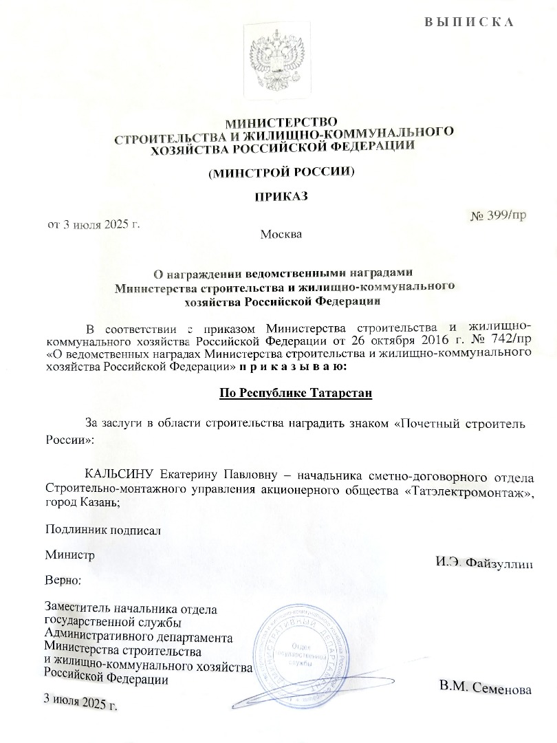 Министерство строительства и ЖКХ РФ присвоило звание "Почетный строитель" Екатерине Павловне за вклад в развитие строительства. Награда вручена 3 июля 2025 года в Москве по приказу № 399/ пр, подписанному министром И.Э. Файзуллиным, за успехи в отрасли.