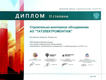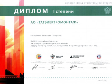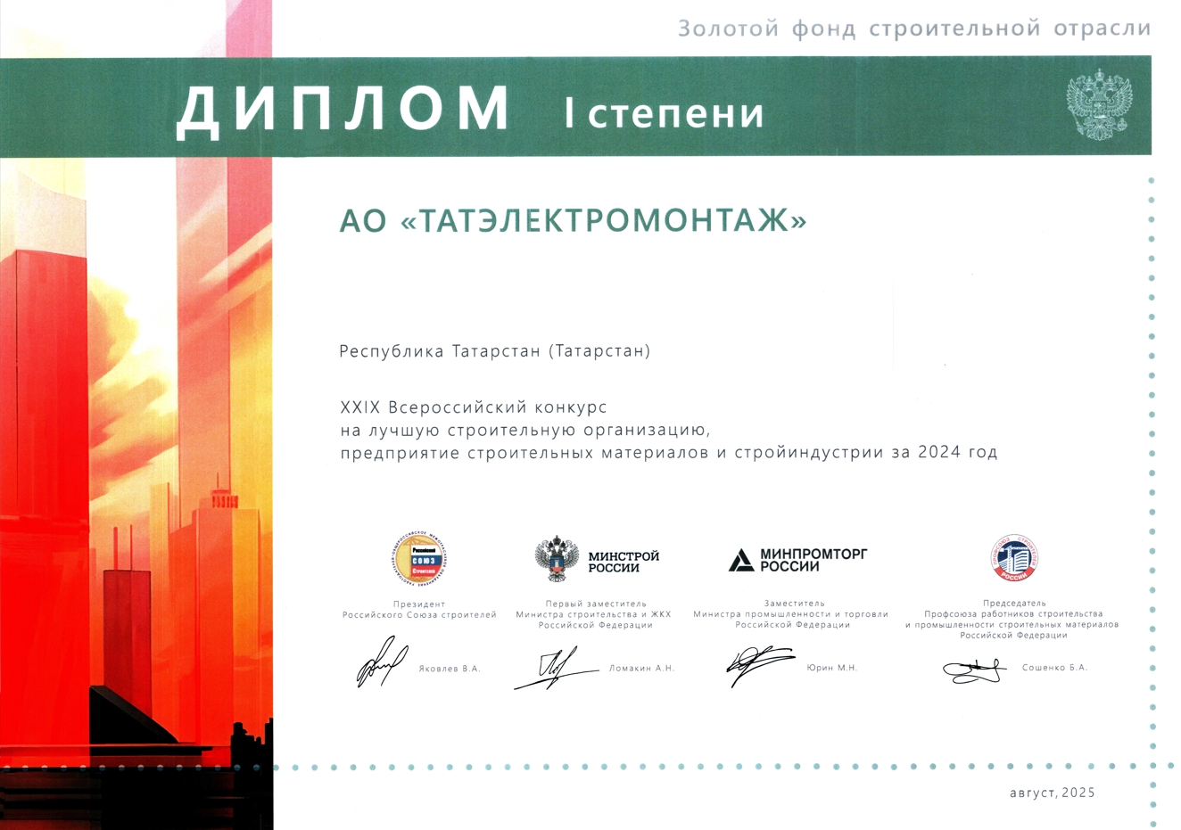 АО «ТАТЭЛЕКТРОМОНТАЖ» вошло в «Золотой фонд строительной отрасли»:АО «ТАТЭМ» награждено дипломом I степени (2025), КПНУ и СМО – дипломами II степени (2025). Награды подтверждают высокие стандарты качества и эффективность работы компании, которая продолжает реализовывать проекты в Татарстане и по всей России.